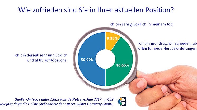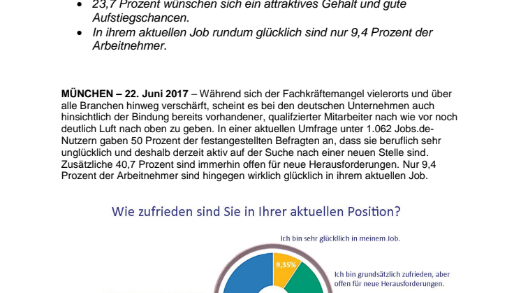 MÜNCHEN – 22. Juni 2017 – Während sich der Fachkräftemangel vielerorts und über alle Branchen hinweg verschärft, scheint es bei den deutschen Unternehmen auch hinsichtlich der Bindung bereits vorhandener, qualifzierter Mitarbeiter nach wie vor noch deutlich Luft nach oben zu geben. In einer aktuellen Umfrage unter 1.062 Jobs.de-Nutzern gaben 50 Prozent der festangestellten Befragten an, dass sie beruflich sehr unglücklich und deshalb derzeit aktiv auf der Suche nach einer neuen Stelle sind. Zusätzliche 40,7 Prozent sind immerhin offen für neue Herausforderungen. Nur 9,4 Prozent der Arbeitnehmer sind hingegen wirklich glücklich in ihrem aktuellen Job.