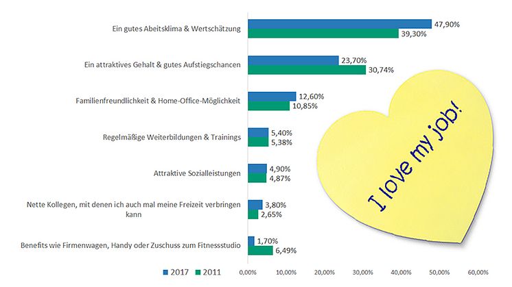 Wie auch schon vor sechs Jahren (knapp 40 Prozent) stehen ein gutes Arbeitsklima und Wertschätzung ganz oben auf der Wunschliste der Befragten. Aktuell sind diese Aspekte sogar für 47,9 Prozent der 1.062 befragten Arbeitnehmer das Wichtigste im Job – und damit noch entscheidender als das Thema Gehalt und Aufstiegschancen (23,7 Prozent). 2011 wünschten sich immerhin noch gut 30 Prozent eine leistungsgerechte Bezahlung. Familienfreundlichkeit und die Möglichkeit, von zu Hause aus arbeiten zu können, ist 12,6 Prozent der Befragten wichtig, gefolgt von regelmäßigen Weiterbildungen und Trainings (5,4 Prozent) und attraktiven Sozialleistungen (4,9 Prozent). Weniger entscheidend für die Zufriedenheit im Job scheinen nette Kollegen zu sein, mit denen Arbeitnehmer auch mal ihre Freizeit verbringen können (3,8 Prozent) und Benefits, wie Firmenwagen, Handy oder ein Zuschuss zum Fitnessstudio (1,7 Prozent).